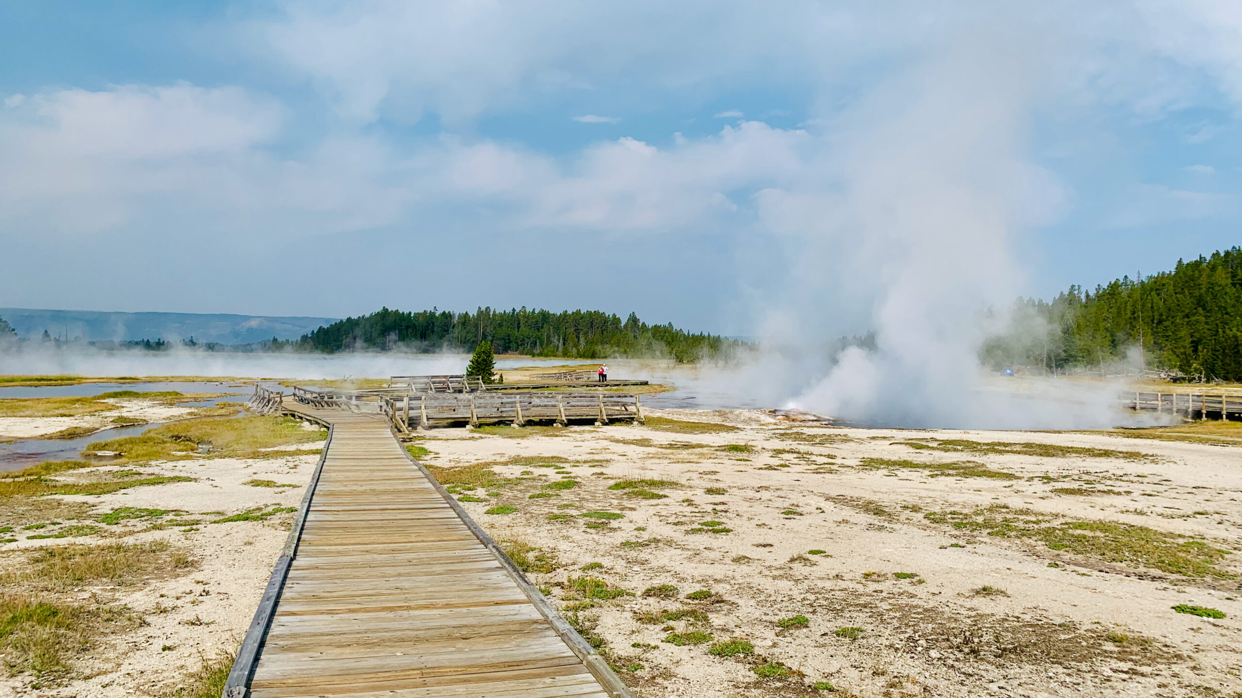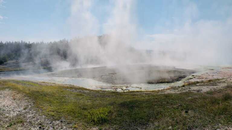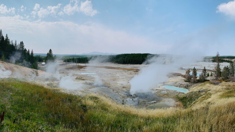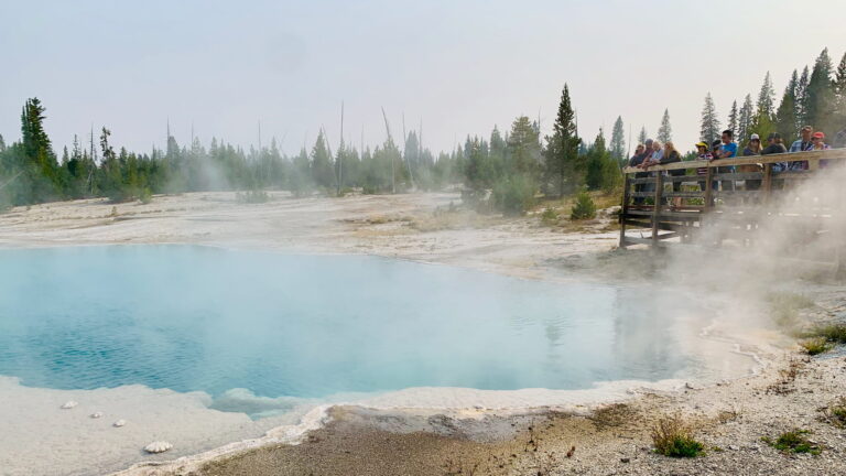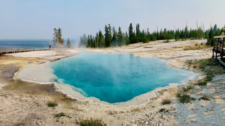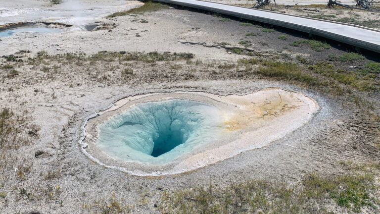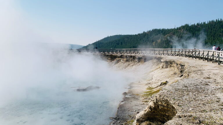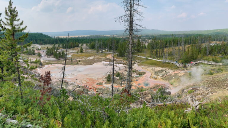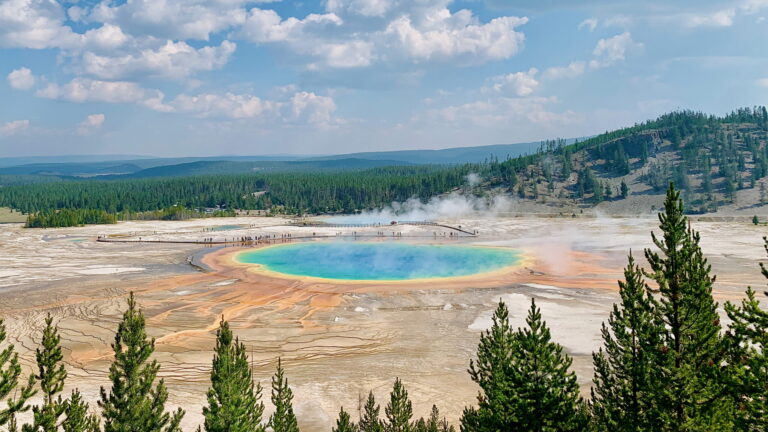 - Midway Geyser Basin: Just up the road from Old Faithful is Midway Geyser Basin – a compact boardwalk loop with some of the park’s most vivid thermal features. Grand Prismatic Spring is the star and you can walk all the way around it which provides a sense of the immense scale of the feature.