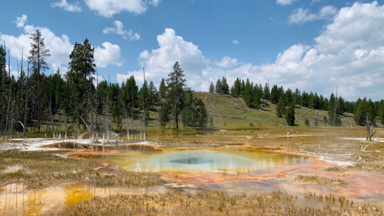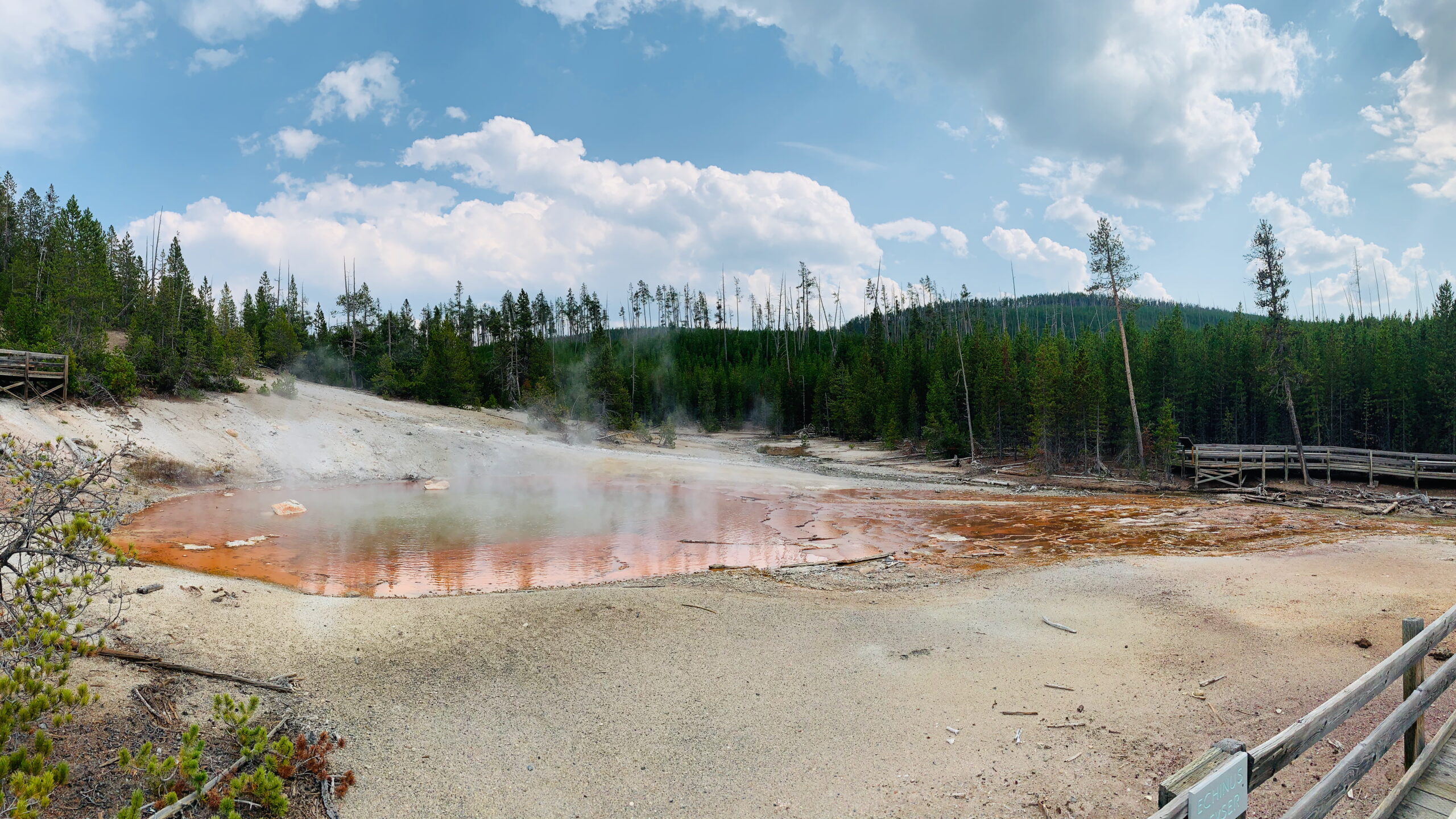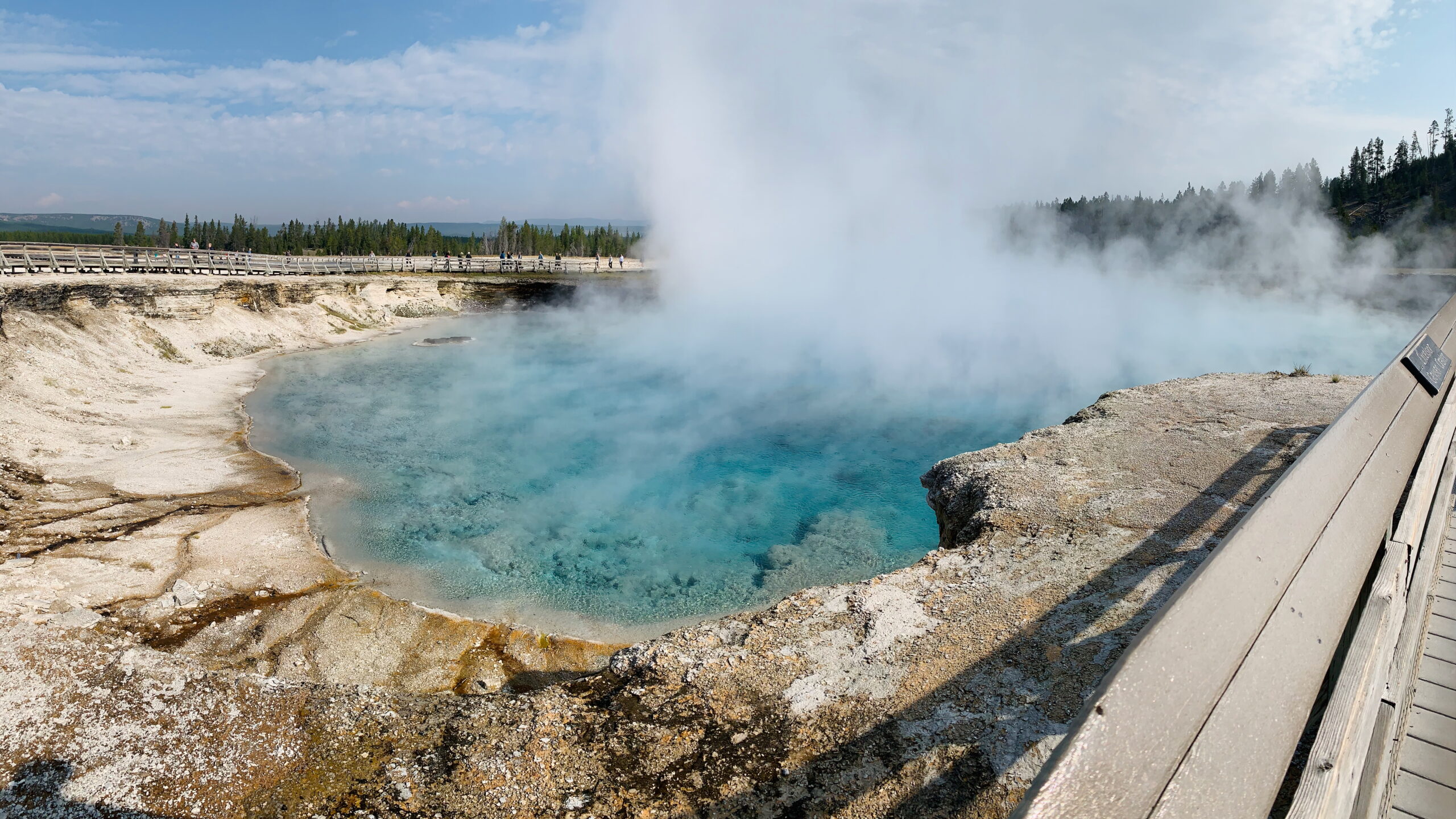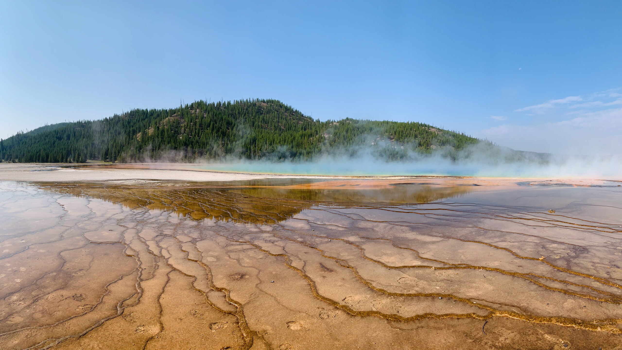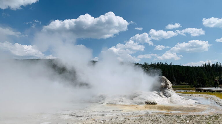 - Midway Geyser Basin: Just up the road from Old Faithful is Midway Geyser Basin – a compact boardwalk loop with some of the park’s most vivid thermal features. Grand Prismatic Spring is the star and you can walk all the way around it which provides a sense of the immense scale of the feature.