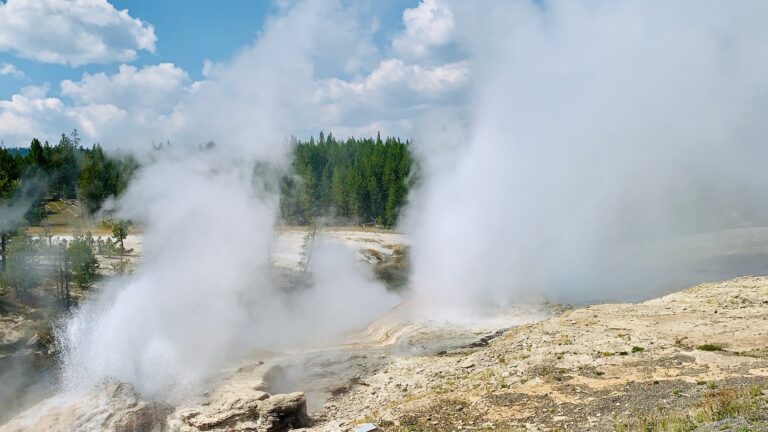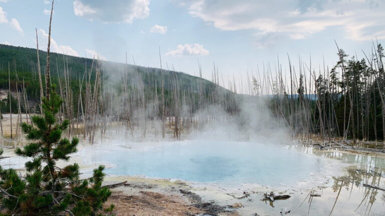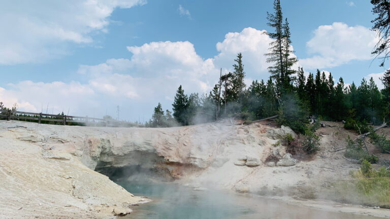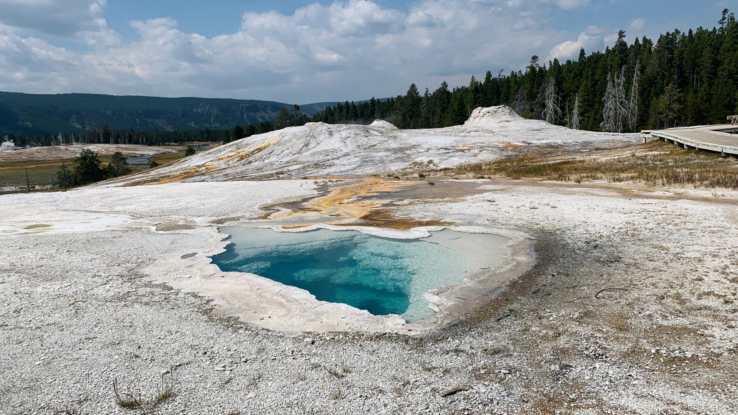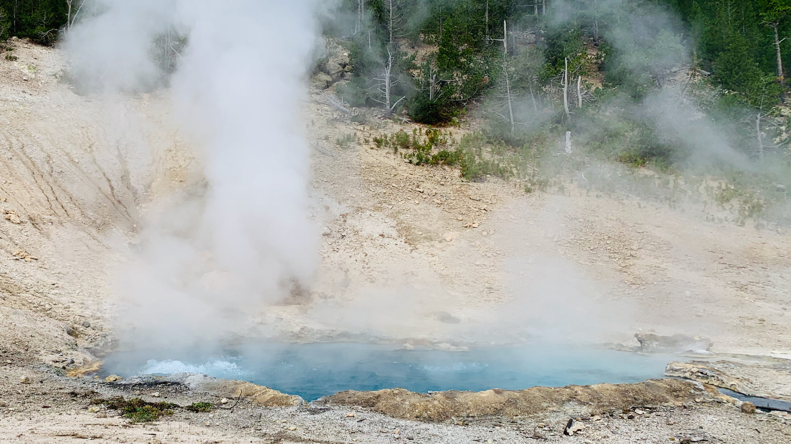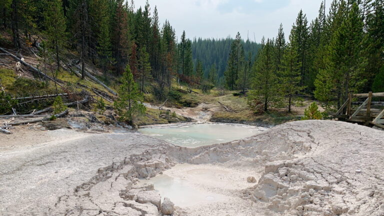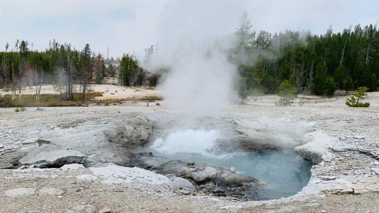 - Biscuit Basin Trail: This short loop is a little further away from the upper geyser trail system but is connected via paved trails. Like many areas of the park, it features bright blue pools, steaming vents, and occasionally erupting geysers.