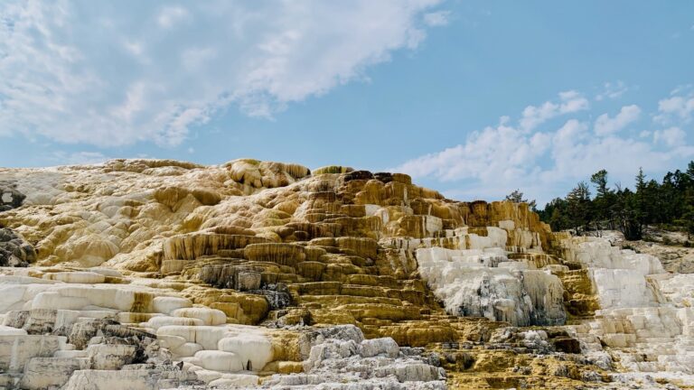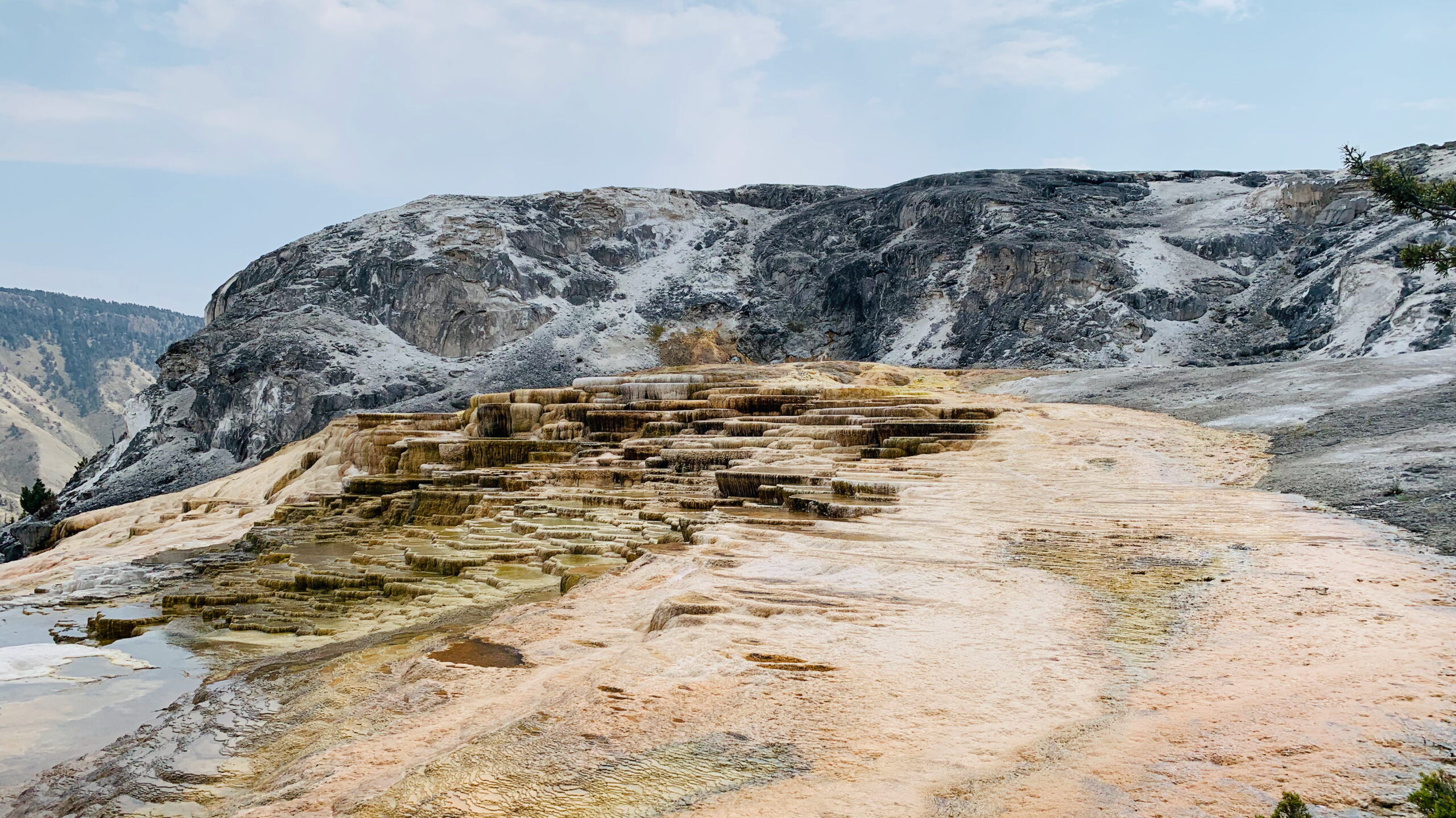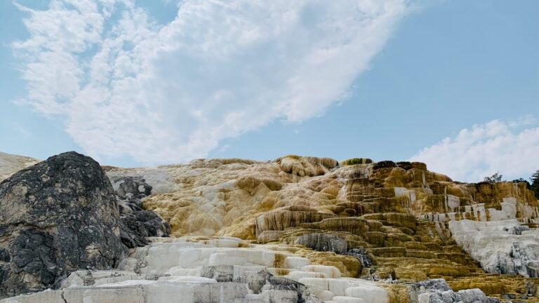 - Mammoth Hot Springs: We stopped by Fort Yellowstone and then went to Mammoth Hot Springs. This area is unique in due to how the water flows from under the earth, bubbling up to flow down terraced limestone formations that look like they’re melting.