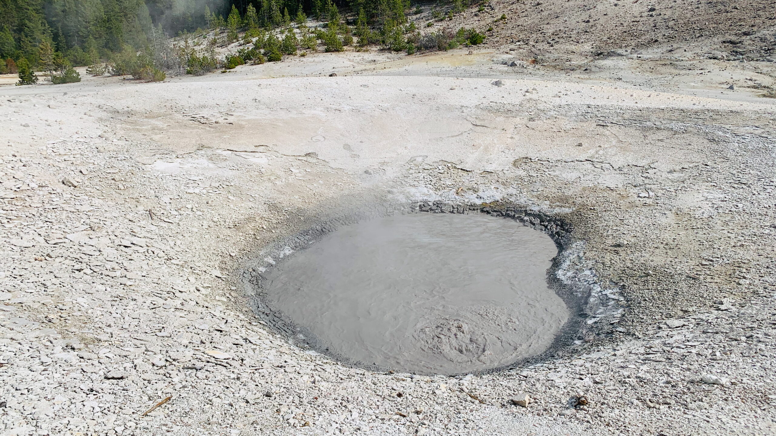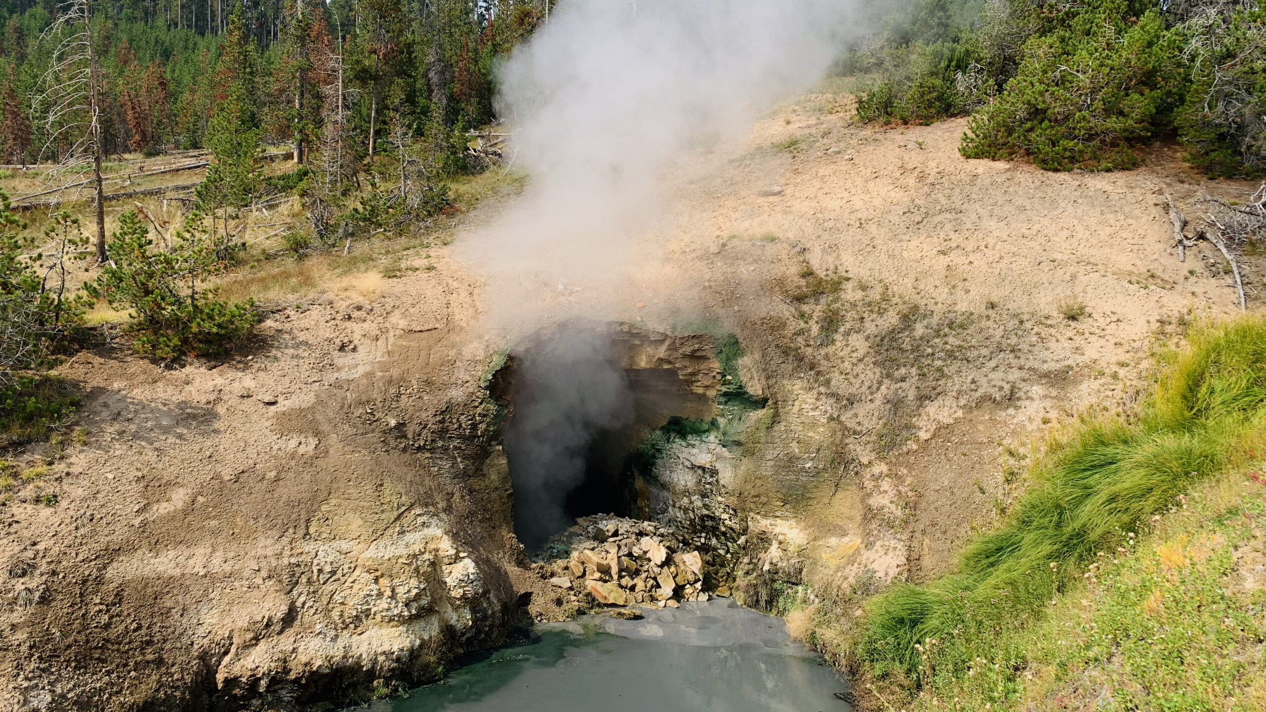 - Mud Volcano Trail: This trail is a short loop with many bubbling mud pots, and hissing vents to look at. It also features a steamy cave called Dragon’s Mouth Spring which is by far the smelliest of all the features we saw in Yellowstone (be prepared!).