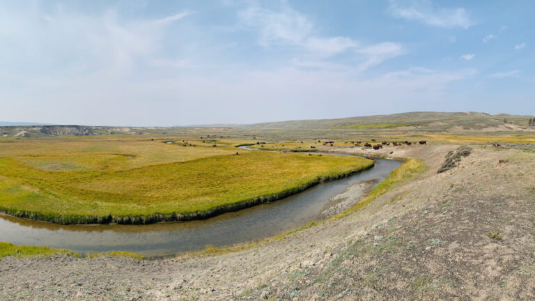 - Hayden Valley / Bison along Yellowstone River: If there’s one place in Yellowstone where you’re almost (almost) guaranteed a view of some bison, it’s Hayden Valley. They’re known for blocking the road in this area, but we found them grazing, napping and playing in the grass a couple hundred feet away and easily found a place to pull off for a few minutes. Pro tip: avoid death or injury and enjoy viewing these giant beasts from a safe distance.