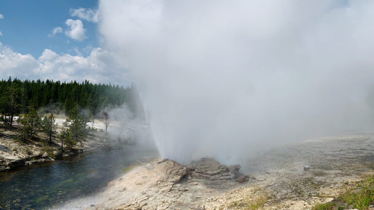 One more thing about Biscuit Basin – this area is also where one of our most memorable moments from our entire trip happened: Fan Geyser. We were about 100 meters from where the walkway crosses the Firehole River, and we heard lots of cheering and commotion. As we walked closer, there were cheers from the growing crowd. Then, right as we caught a glimpse of Fan Geyser, it started erupting… and it kept erupting for a solid 10 minutes! Apparently, this is a very rare event and we just happened to be in the right place at the right time.